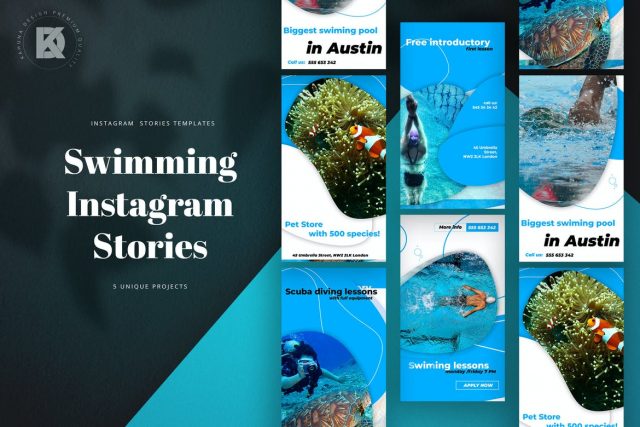 Swimming Instagram Stories contains 5 designs in 1920×1080 px format.