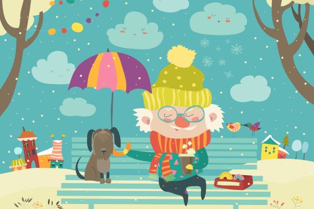 Old man with dog under umbrella Best friends