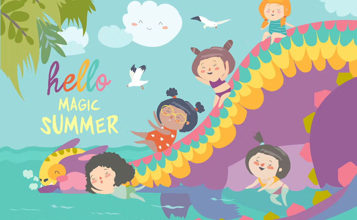 Kids playing with cute dragon at waterpark