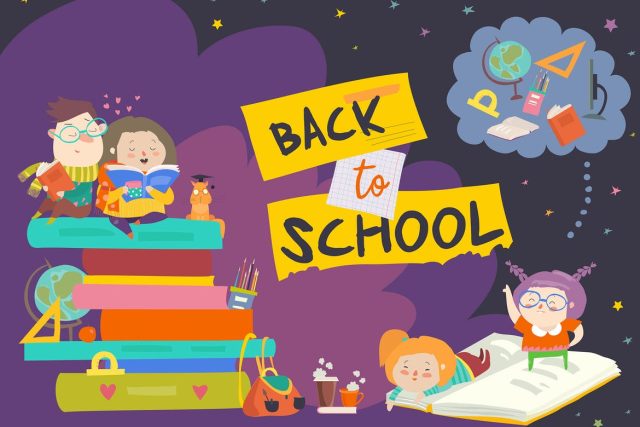 Boy and girl sitting on piles of books