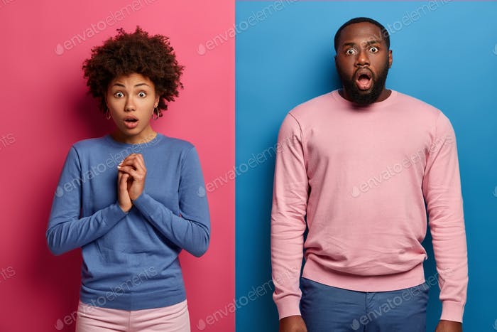 Concerned puzzled ethnic couple stare with great shock