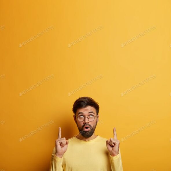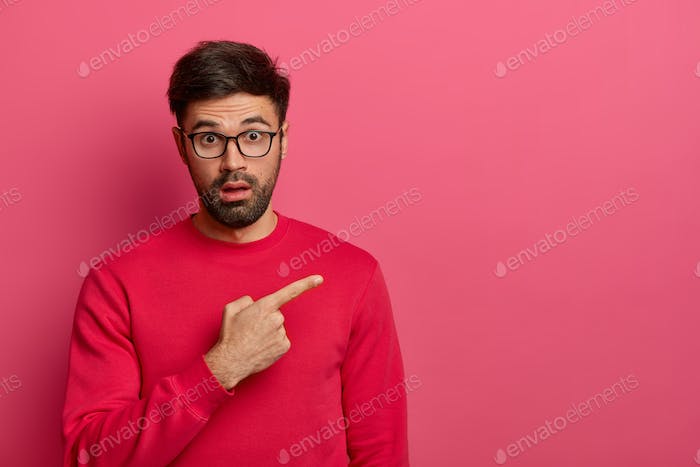 Stunned bearded young man shows unbelievable presentation