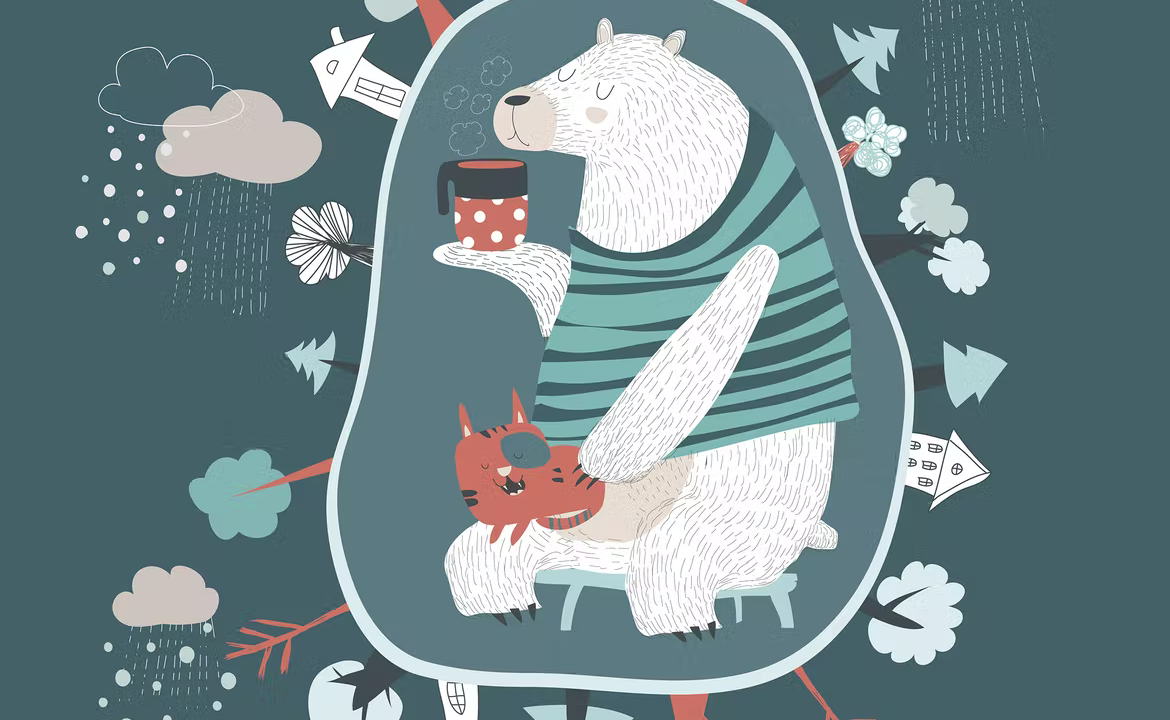 Cute cartoon bear with little cat in den. Vector