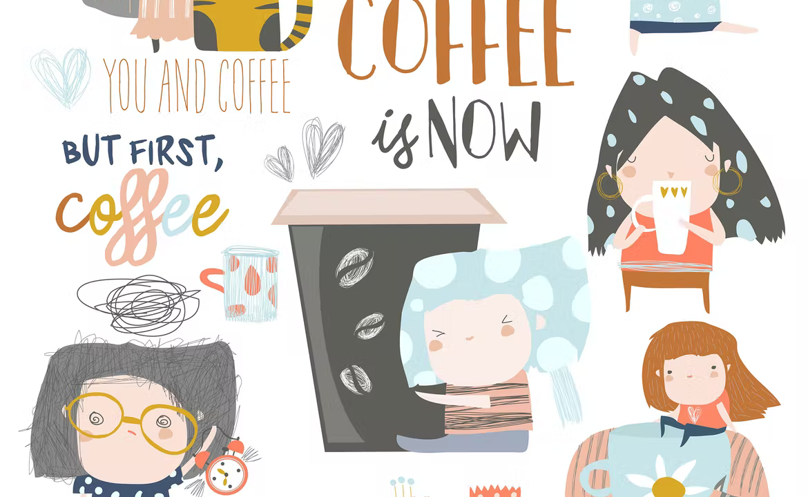 Cute young girls drinking coffee Vector set