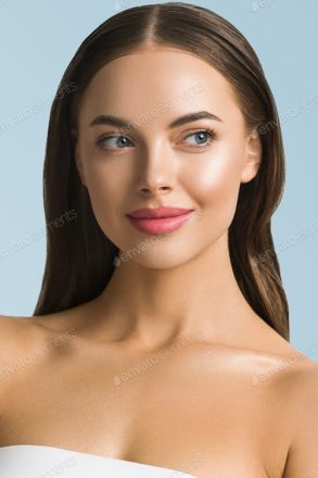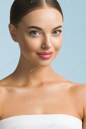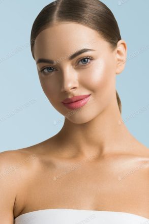 Clean skin beauty woman face healthy skin natural make up tanned female over blue