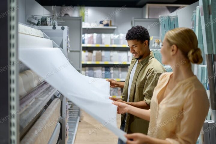 Family couple choosing wallpaper for house renovation