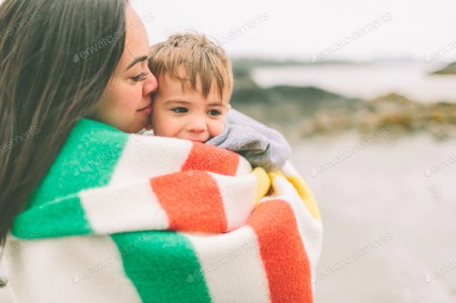 A mother holding a little boy while wrapped in a colourful blanket on the beach