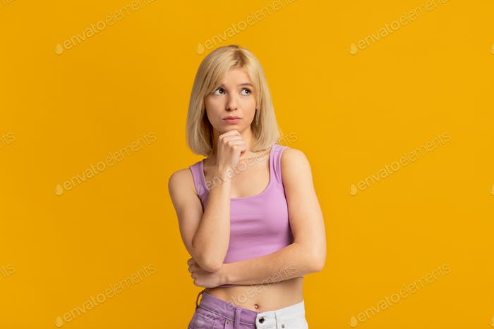 Doubtful woman thinking about offer or proposal