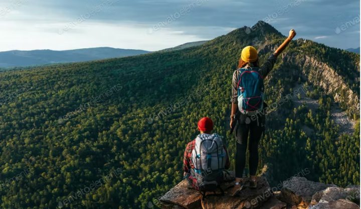 A man and a woman with backpacks on the mountain