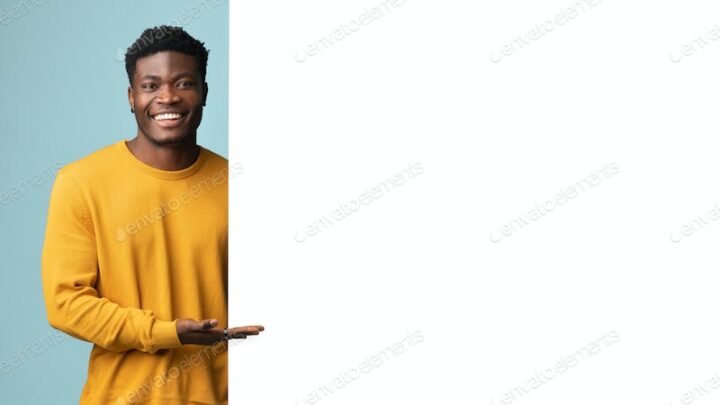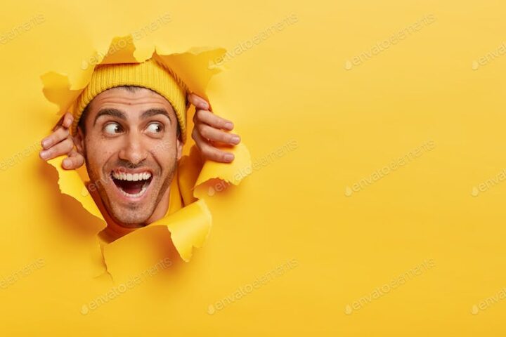 Satisfied cheerful guy with broad toothy smile sticks head through ripped hole in yellow paper back