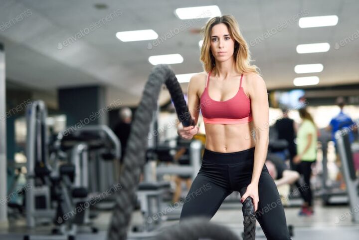 Woman with battle ropes exercise in the fitness gym.