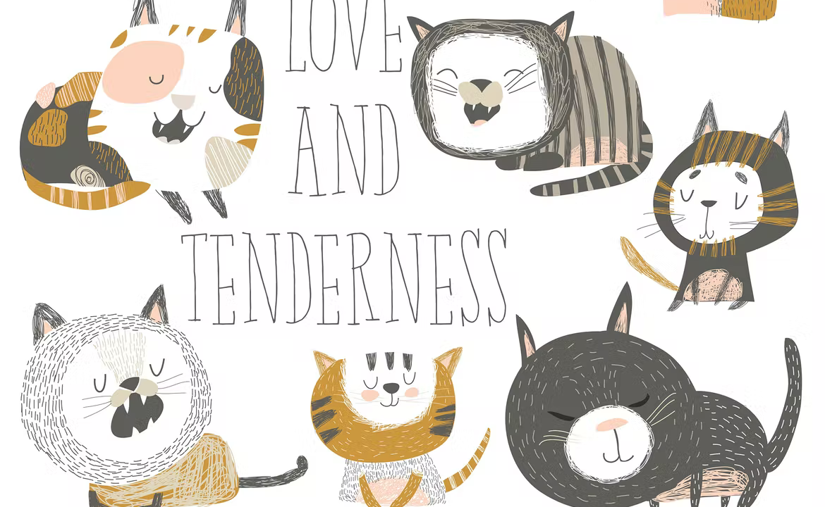 Cute cats in different poses on white background.