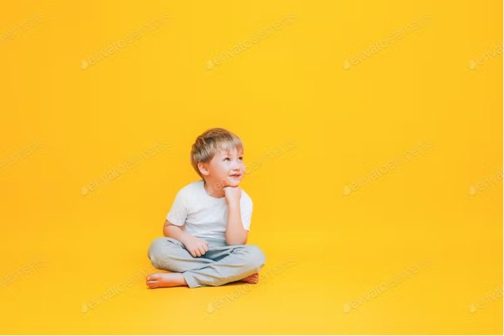 Pensive little boy in white t-shirt sitting on yellow background