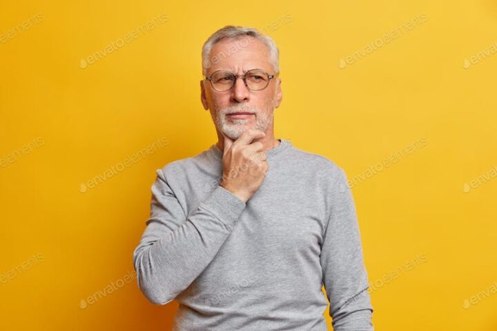 Senior thougthful man holds chin and looks pensively aside makes plannings wears spectacles and casu