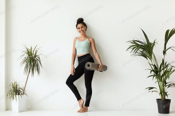 Yoga Coach Beautiful Smiling Woman Holding Fitness Mat Posing Near White Wall