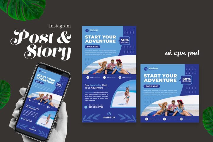Travel Agency Instagram Story Post. A creative promotion for your business and spread with instagram Story and Post. This creative design is completely editable to suit your brands colors and corporate fonts.
