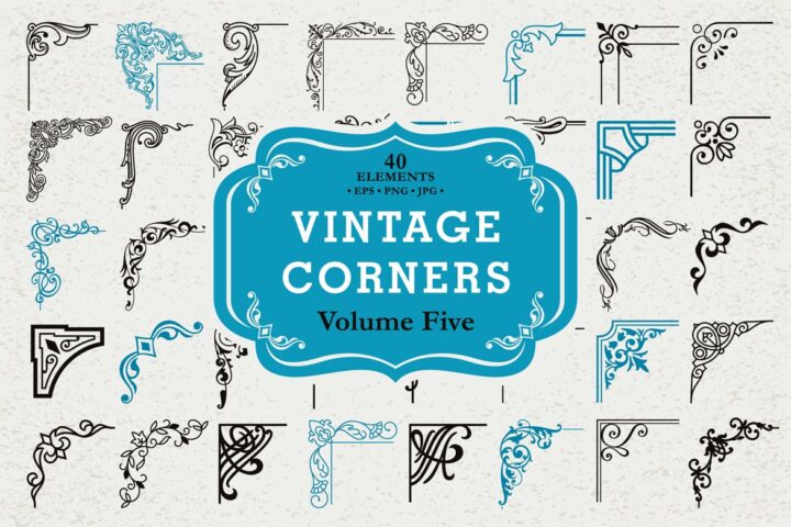 Big set of 40 vector classic vintage retro style corners. Nice for making new frames and borders, decorate your pages, invitations, certificates etc. This is not scanned vintage elements, so all shapes and details are nice, sharp and clean.
