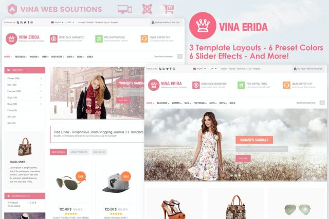 Vina Erida is responsive multipurpose Joomla 3.x Template powered by JoomShopping e-commerce component, profesional design, high quality code and retina ready. Vina Erida is perfectly suited for any business websites, e-shops, portfolios, corporate, blogs, marketing or technology website, photo, services and others… Aside from just looking beautifully polished and clean, it comes packed with features and options, powerful Helix II Framework, 3 Home Page layout (2 for Online Shop, 1 for Business and other coming soon), 6 preset colors options, 9 popular Joomla 3.x Extensions from VinaGecko.com: Vina Camera Image Slider, Vina Article Carousel, Vina Product Carousel for JShopping, Vina Manufacturers Carousel for JShopping, Vina Vertical News Ticker, Vina Product Ticker for JShopping, Vina Treeview for JShopping, Vina Article Accordion, Vina Category Menu for JoomShopping. It’s easily configured various modules positions and a lot other best and selected extensions help you to develop your site in no time.