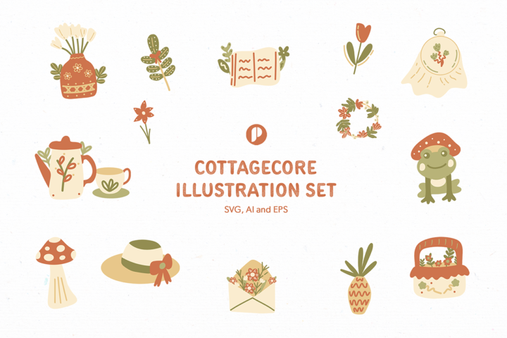 Warm Cottagecore Illustration Set consists of 15 illustrations, available in three different format files, AI, SVG, and EPS. You can use it on your graphic project using the suitable and comfortable application you usually use. You can duplicate as many as you want or resize the item as small or as big as you need. This illustration set is very easy to use, and you will not have any major difficulties when using it.