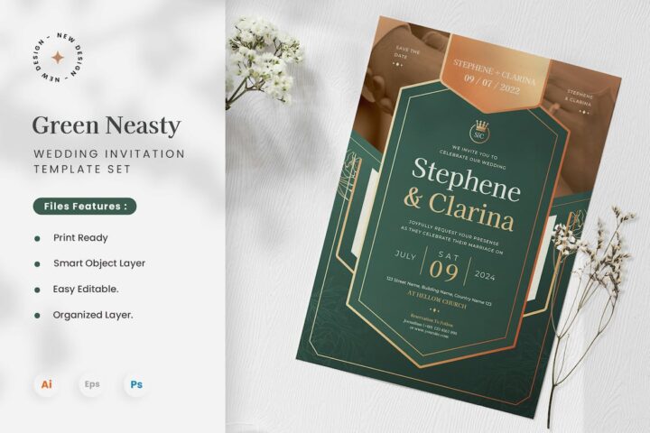 This trendy wedding invitation and save the date set is ideal for any DIY couple that wants to express themselves! Each color of the invitation and save-the-date has its own Adobe Illustrator file. For easy customization, layers are meticulously ordered and named. Have a wonderful time planning your wedding!. All the elements in the design such as text, colours, styles and images can be easily edited.